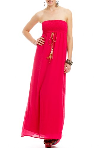 2b by bebe , Chic to the max! This simple 2b strapless maxi dress features a crinkly high sheen fabric with a smocked top and keyhole opening in back. The punch? A microsuede tie in front with boho feather and beaded detailing. Team it with a colorful wedge to maximize your style. Lined. Center back to hem: 50"